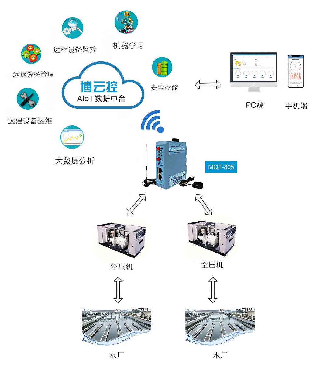 随着环保意识的提高以及政府投资力度的加大,水处理项目也是越来越多。空压机是水厂生产的重要设备,它为水厂所有气动元件,包括各种气动阀门,提供气源,也用于向滤池底部曝气,使滤池内部充分搅拌。客户想通过远程监控空压机的状态来维系水厂的正常生产,一旦发现空压机有异常状态或趋势,能够及时做相关处理。