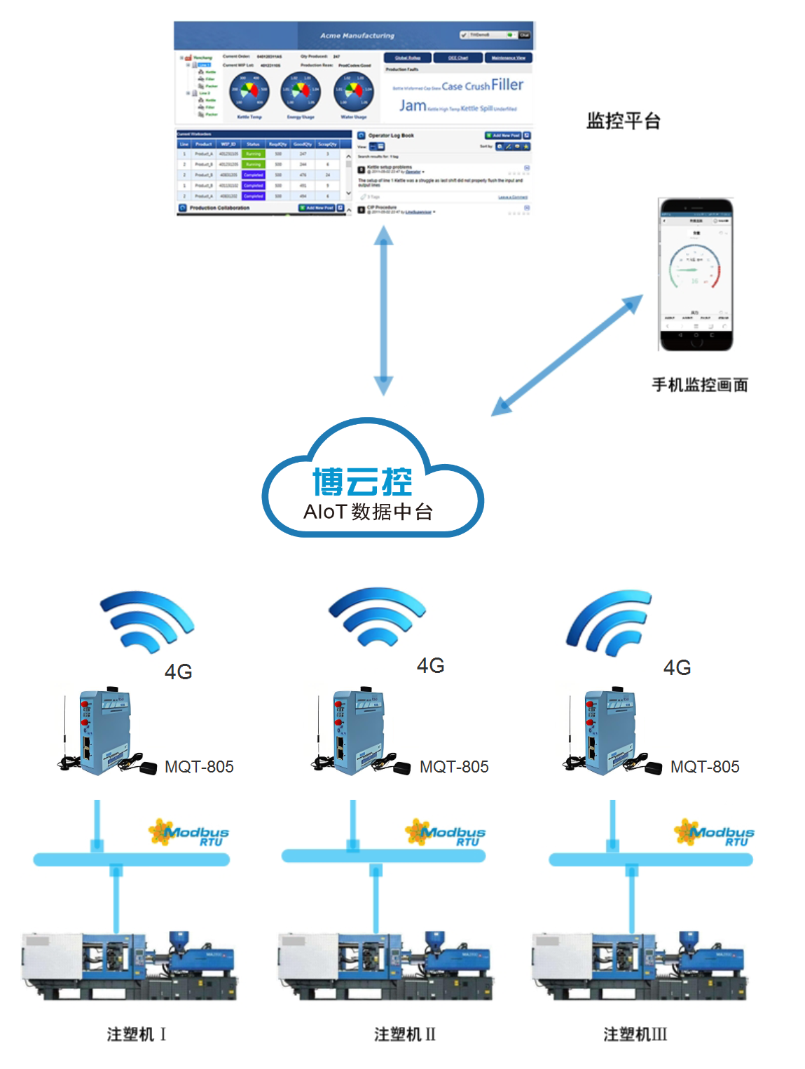在本系统中,工厂的生产设备为注塑机,它是用来将热塑性塑料或热固性塑料利用塑料成型模具制成各种形状的塑料制品的主要成型设备。由于注塑机在工厂的位置分布比较分散,布线比较麻烦,监控中心希望远程无线实时监控设备的生产和运营情况,注塑机有RS485通讯串口且支持Modbus RTU协议,上海泗博自动化公司为客户提供一套完整的解决方案,首先为每一个注塑机配置一个MQT-805网关,MQT-805网关能够采集注塑机的生产和运营等参数通过4G无线传输到上海泗博的博云控AIoT数据中台对接。上海泗博根据客户现场的实际情况为客户定制开发对应的监控界面,监控中心只需通过Internet访问上海泗博的博云控AIoT数据中台登陆自己的账号和密码就能在监控中心显示对应的监控画面,实时监控每台注塑机的生产和运营情况,通过手机移动端访问博云控AIoT数据中台也能够实时监控注塑机的工作生产参数。一旦设备的某些影响生产质量或设备工作的重要参数超出预定范围,监控界面能够及时发出报警通过微信到现场维护人员的手机移动端,维护人员根据指定设备的报警参数情况,及时采集正确的维护措施,大大提高维护效率及注塑机的生产质量和工作长期稳定性。博云控AIoT数据中台利用其数据分析和机器学习的能力,通过参考历史参数信息,对报警和设备维护的预测性能,对设备故障提前作出预判,防止重大事故的发生,保证工厂设备的正常生产和工作!