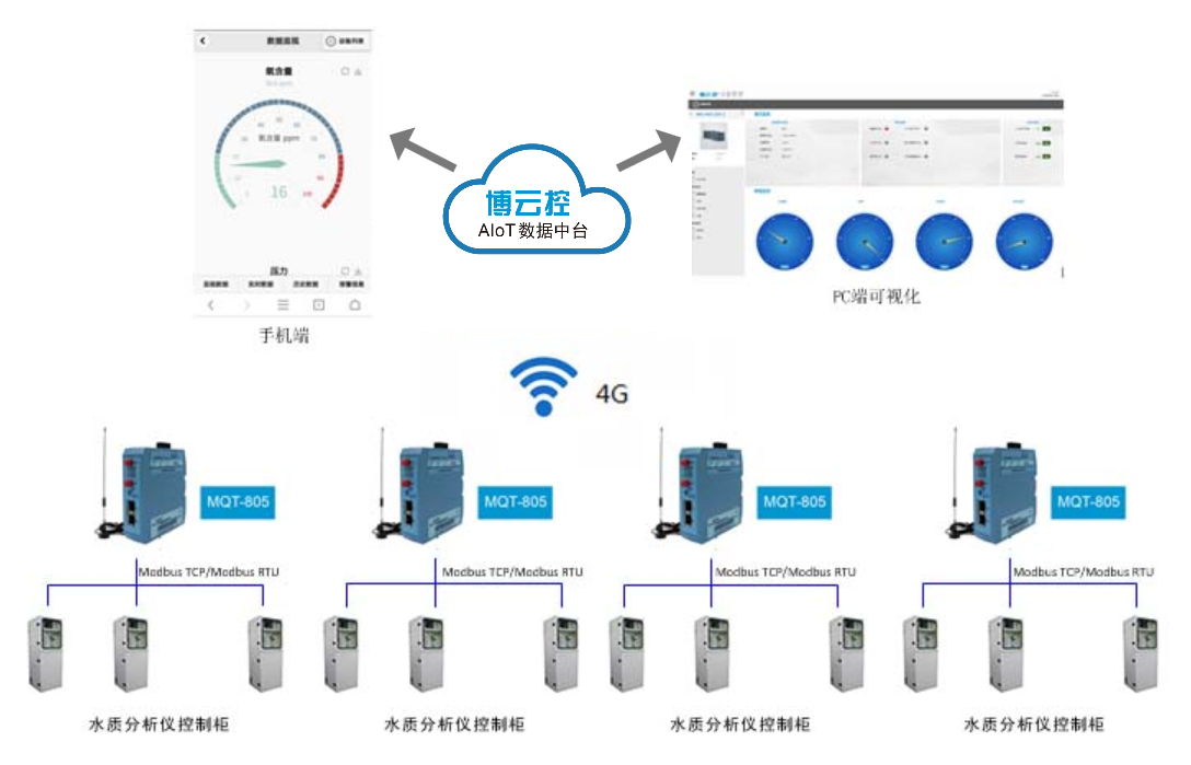 通过在水质分析仪控制柜安装MQT-805,对水质分析仪的运行数据进行采集并通过4G网络发送至博云控AIoT数据中台中,数据中台再对数据进行统一化处理、存储。数据中台分析水质数据状态,做到水污染事件早发现早处理,确保水资源的可持续利用,同时将数据发布至数据展示端(包括PC端、手机端等)。市控水站通过数据中台对河道水质的状态、报警信息等数据进行云端监测,大幅提升了区域水污染防治的工作效率。